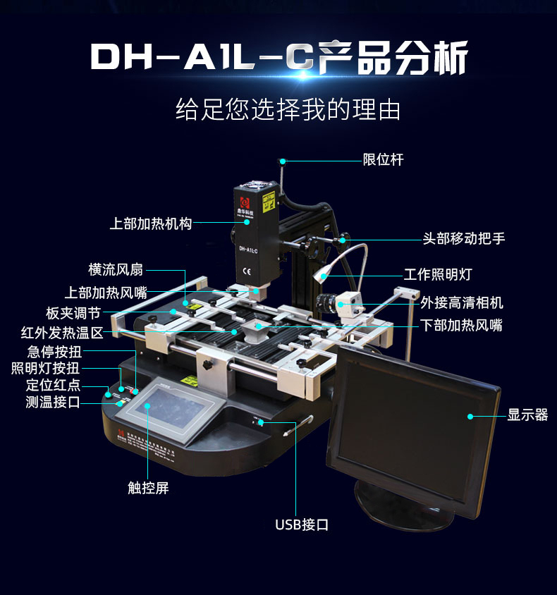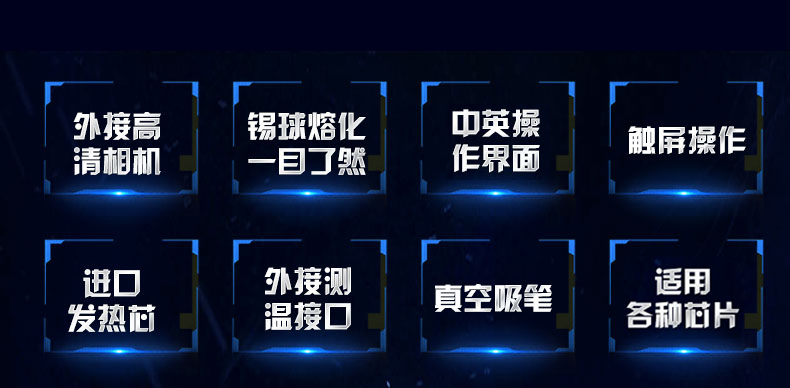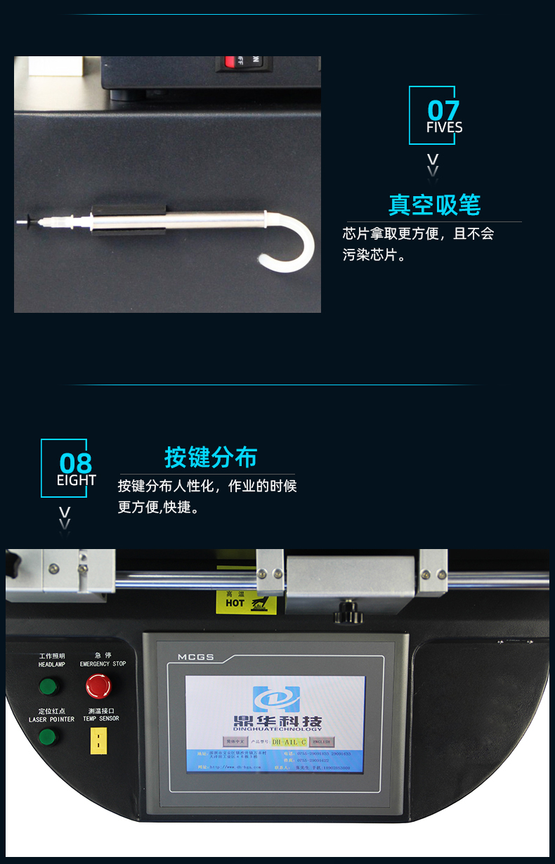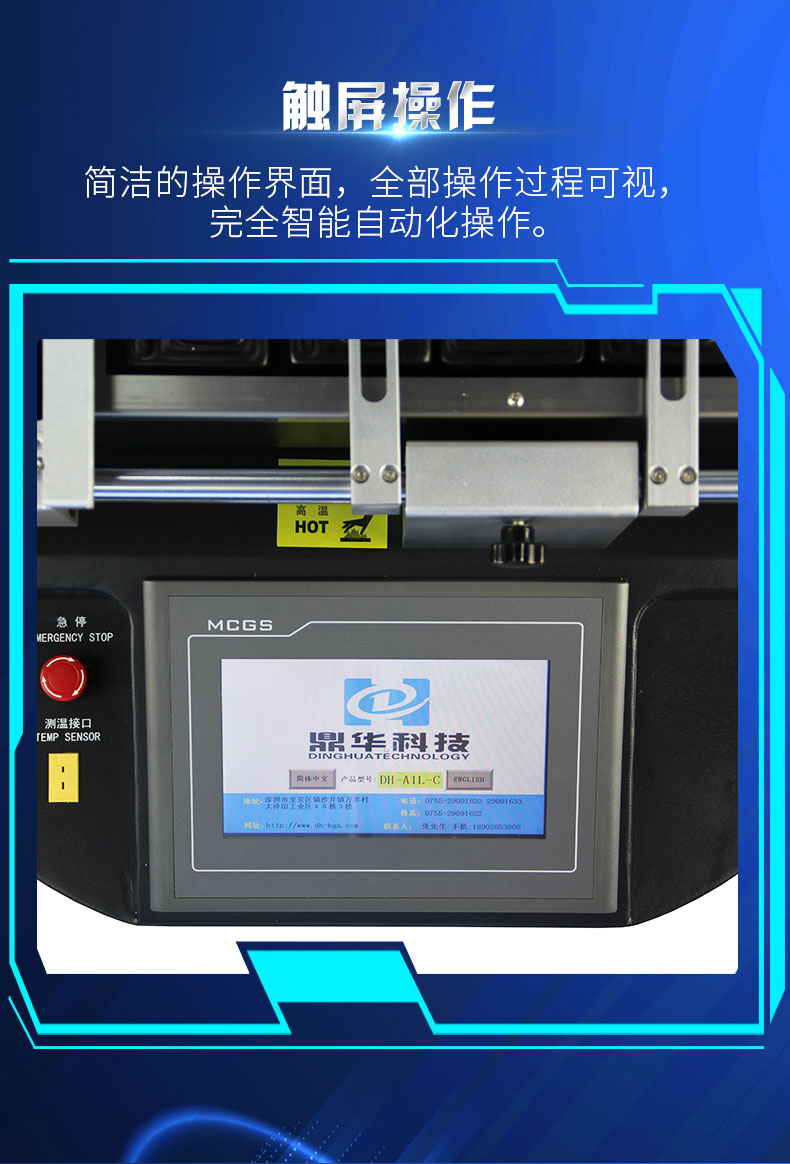1. 觸屏操作,程序預(yù)先內(nèi)置,無須專業(yè)技術(shù)培訓(xùn)即可熟練使用,使芯片返修變得非常簡單;