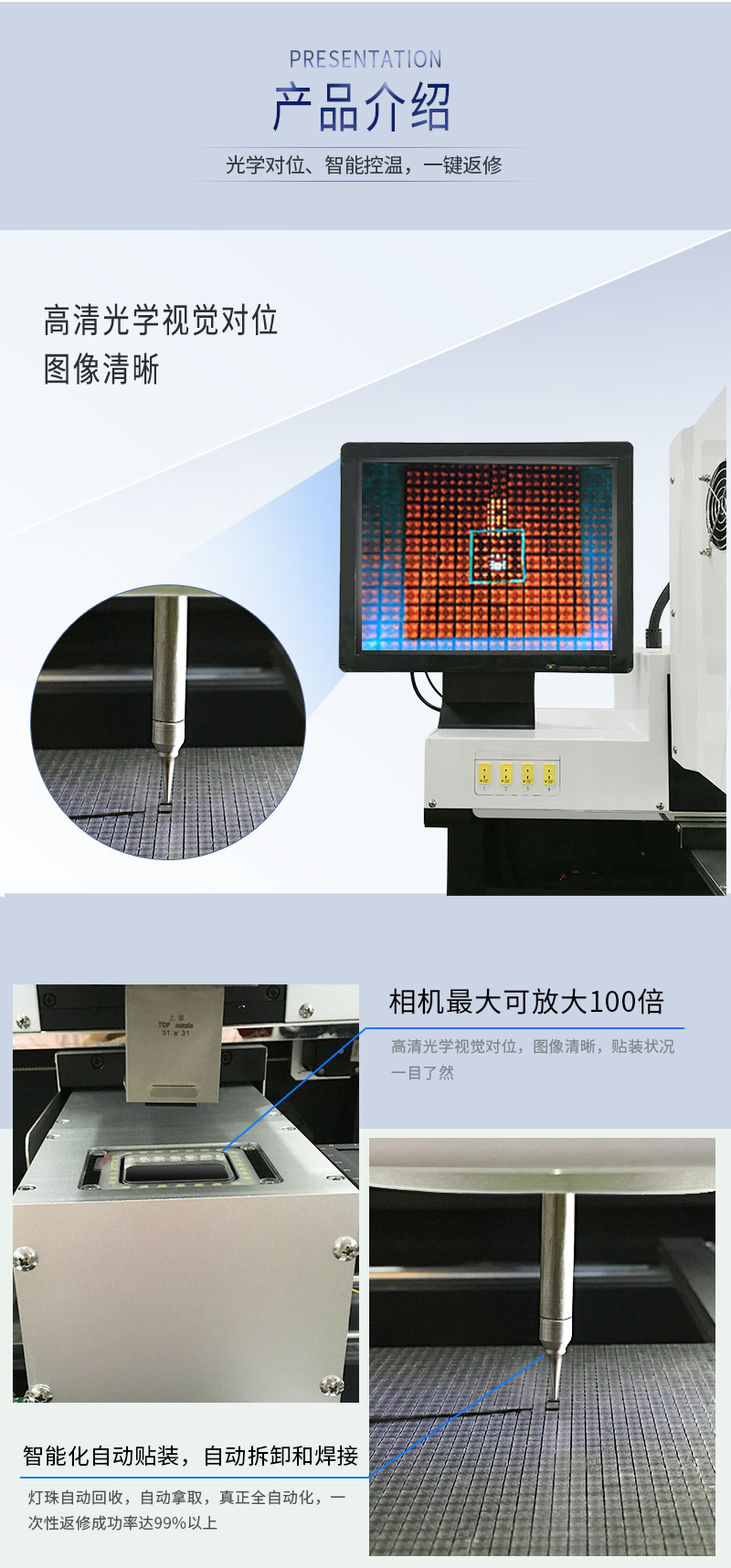 3. 貼裝、拆卸模式下具備自動到指動位置吸取芯片及放置芯片功能,使機器操作更加智能化;