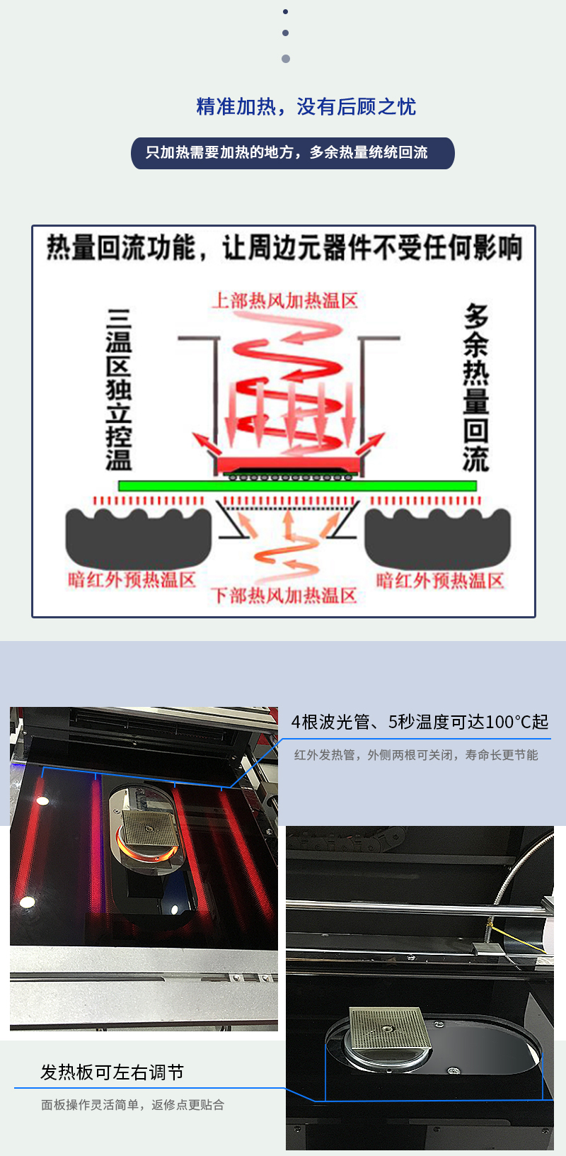 5.預(yù)熱區(qū)采用紅外發(fā)光管,升溫快,恒溫穩(wěn)定,環(huán)保節(jié)能,外形美觀;