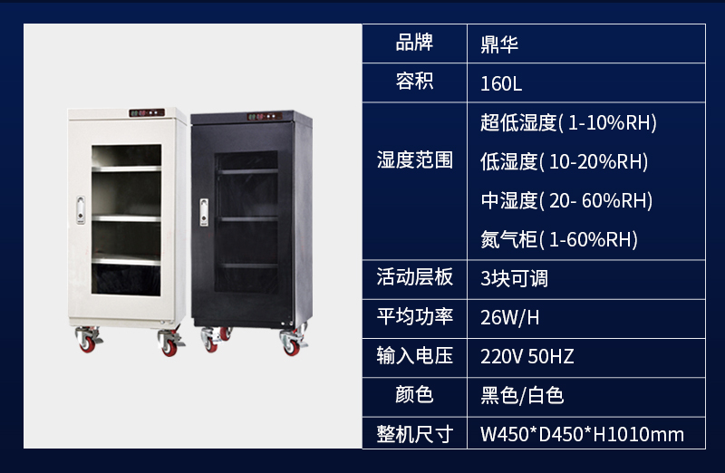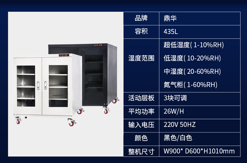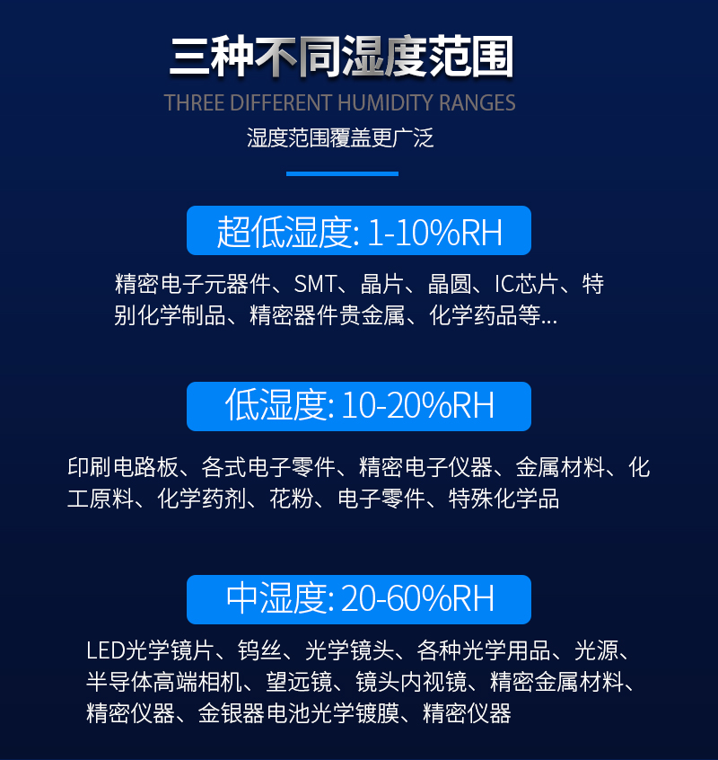 隨著人們對防潮除濕的認(rèn)識越來越多,防潮箱、干燥柜的使用范圍也越來越廣,但是不同物品對于濕度的范圍要求也不盡相同,防潮箱能夠根據(jù)您不同物品的需求,供應(yīng)出不同規(guī)格的防潮箱常規(guī)型(20-60RH%)快速低濕型(10-60RH%),快速超低濕型(5-60RH%)為您推薦合適的防潮箱,為您解決所有物品的防潮除濕向題。